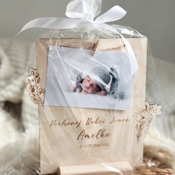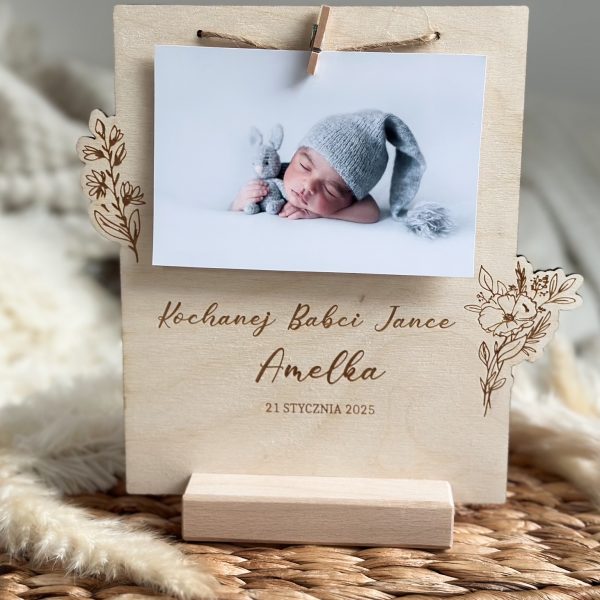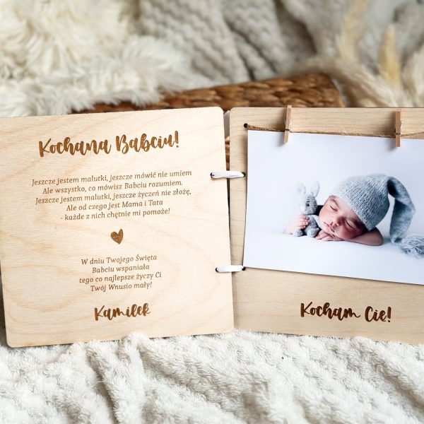 Personalizowana ramka na zdjęcie z okazji Dnia Babci i Dziadka będzie idealnym pomysłem na upominek w tak ważnym dniu! Zdjęcie przyczepione na klamerki oraz wygrawerowane życzenia z podpisem.