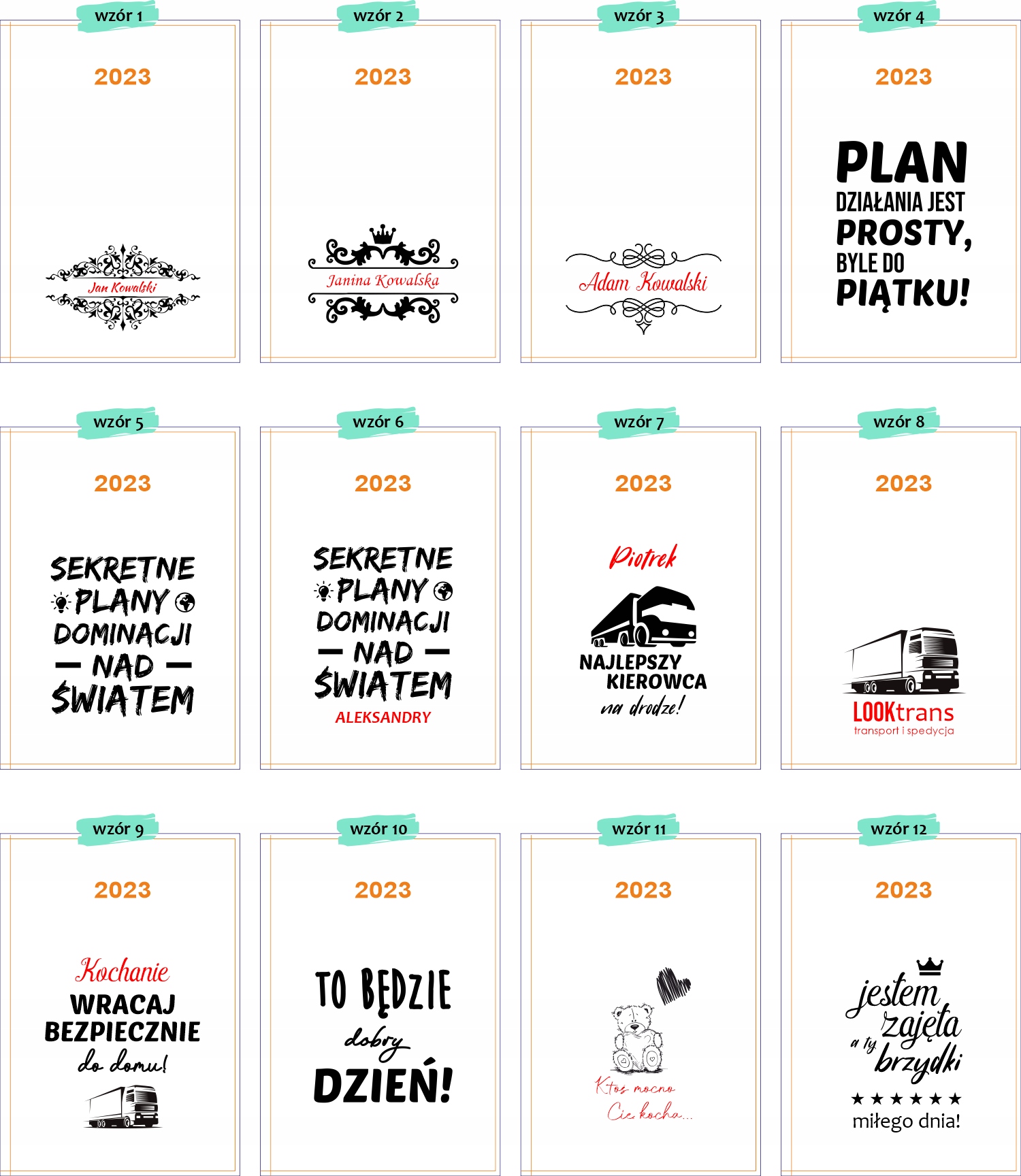 - W przypadku personalizacji kalendarzy (np. każdy z innym imieniem i nazwiskiem) prosimy wysyłać w takiej formie jak ma znaleźć się na kalendarzach np. Jan Kowalski (nie ingerujemy w plik personalizacji Klienta, jeśli otrzymamy dane „Kowalski Jan” to tak wygrawerujemy).